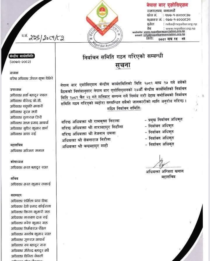 नेपाल बार एशोसिएशन केन्द्रीय कार्यसमितिको मिति २०५१ माघ १७ गते बैठकले मिति २०८१ चैत २३ गते निर्वाचन सम्पन्न हुने निर्णय गरेको हो ।